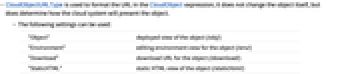- CloudObjectURLType is used to format the URL in the CloudObject expression; it does not change the object itself, but does determine how the cloud system will present the object.