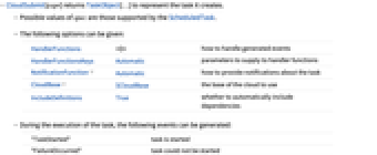HandlerFunctions <||> how to handle generated events HandlerFunctionsKeys Automatic parameters to supply to handler functions NotificationFunction Automatic how to provide notifications about the task CloudBase $CloudBase the base of the cloud to use IncludeDefinitions True whether to automatically include dependencies - During the execution of the task, the following events can be generated: