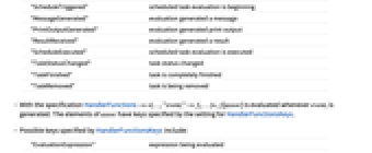 "TaskStarted" task is started "FailureOccurred" task could not be started "ScheduleTriggered" scheduled task evaluation is beginning "MessageGenerated" evaluation generated a message "PrintOutputGenerated" evaluation generated print output "ResultReceived" evaluation generated a result "ScheduleExecuted" scheduled task evaluation is executed "TaskStatusChanged" task status changed "TaskFinished" task is completely finished "TaskRemoved" task is being removed - With the specification HandlerFunctions-><|…,"eventi"->fi,…|>, fi[assoc] is evaluated whenever eventi is generated. The elements of assoc have keys specified by the setting for HandlerFunctionsKeys.