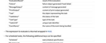 "EvaluationExpression" expression being evaluated "EvaluationResult" result of the evaluation "Failure" failure object generated if task failed "MessageOutput" content of message generated "PrintOutput" content of print output generated "Task" the object representing the task "TaskStatus" the status of the task "TaskType" type of the task "TaskUUID" unique task identifier "EventName" the name of the event being handled - The expression to evaluate is returned wrapped in Hold.