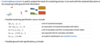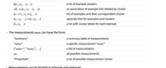 {{e1,e2,…},…} a list of example clusters <|l1{e1,e2,…},…|> an association of example lists labeled by cluster {e1l1,e2l2,…} list of examples and their correspondent cluster {e1,e2,…}{l1,l2,…} separate lists for examples and clusters {l1,l2,…} a list with cluster labels for each example - The measurements meas can have the form: