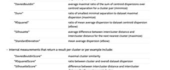 "CalinskiHarabasz" ratio between average separation and average centroid dispersion (maximize) "DaviesBouldin" average maximal ratio of the sum of centroid dispersions over centroid separation for a cluster pair (minimize) "Dunn" ratio of smallest minimal separation to dataset maximal dispersion (maximize) "RSquared" ratio of mean average dispersion to dataset centroid dispersion (elbow) "Silhouette" average difference between intercluster distance and intercluster distance for the next nearest cluster (maximize) "StandardDeviation" mean average dispersion (elbow) - Internal measurements that return a result per cluster or per example include: