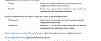 "PurityScore" largest fraction of examples sharing the same ground truth assignment in each cluster "RandScore" fraction of (ei,ej) pairs that correctly share or do not share the same ground truth assignment in each cluster - ClusteringMeasurements[…,{"prop1","prop2",…}] can be used to compute multiple properties.
