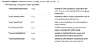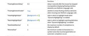 "AttachedBrowserEnable" True whether to offer contextual UI elements like color choosers when typing Wolfram Language expressions "AutoConvertEnable" True whether to offer to convert expressions that do not look like code to other forms "AutoPopupDelay" 0.0 delay in seconds before the autocompletion popup appears "AutoPopupEnable" True whether autocompletion popup elements appear automatically when typing "DynamicHighlighting" True whether to highlight function heads and brackets based on the cursor position "FileCompleteEnable" True whether to offer filename completions when typing string arguments of appropriate functions "FloatingElementDelay" 0.3 delay in seconds after the mouse has stopped moving before displaying floating interface elements over Wolfram Language code "FloatingElementEnable" True whether to show floating interface elements when mousing over Wolfram Language code "HeadHighlightStyle" {Background