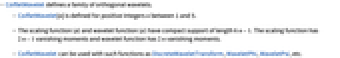 - CoifletWavelet[n] is defined for positive integers n between 1 and 5.