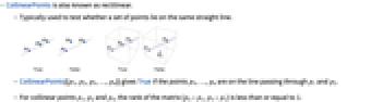 - CollinearPoints[{p1,p2,p3,…,pn}] gives True if the points p3,…,pn are on the line passing through p1 and p2.