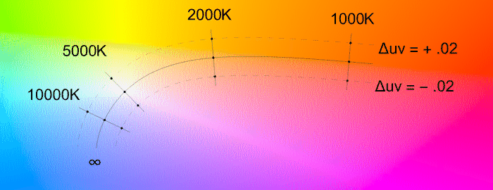 . - Temperature and tint can be visualized in the MacAdam chromaticity diagram below, where the curve corresponds to a radiating blackbody and tint adjustments are moves on isothermal lines, orthogonal to the temperature curve.