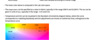 color explicit color whitepoint named white point as used as a setting for WhitePoint temperature color specified by a temperature {temperature,tint} color specified by a temperature and a tint {pos1,pos2,…} mean color at positions posi in the original image markerimage mean color sampled according to a marker image - The mean color above is computed in the Lab color space.