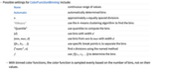 None continuous range of values Automatic automatically determined bins n approximately n equally spaced divisions "KMeans" use the k-means clustering algorithm to find the bins "Quantile" use quantiles to compute the bins {d} use bins with width d {min,max,d} use bins from min to max with width d {{b1,b2,…}} use specific break points bi to separate the bins {"name",n} find n divisions using the named method f use f[{v1,v2,…}] to determine the bins - With binned color functions, the color function is sampled evenly based on the number of bins, not on their values.