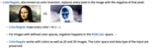 - ColorNegate works with colors as well as 2D and 3D images. The color space and data type of the input are preserved.