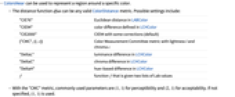 - The distance function dfun can be any valid ColorDistance metric. Possible settings include: