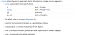 n levels 1 through n Infinity levels 1 through Infinity {n} level n only {n1,n2} levels n1 through n2 - The default value for levelspec in Comap is {1}.