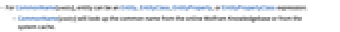 - For CommonName[entity], entity can be an Entity, EntityClass, EntityProperty, or EntityPropertyClass expression.
