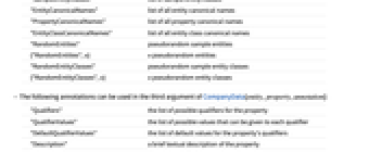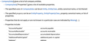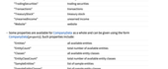 "Entities" all available entities "EntityCount" total number of available entities "Classes" all available entity classes "EntityClassCount" total number of available entity classes "SampleEntities" list of sample entities "SampleEntityClasses" list of sample entity classes "EntityCanonicalNames" list of all entity canonical names "PropertyCanonicalNames" list of all property canonical names "EntityClassCanonicalNames" list of all entity class canonical names "RandomEntities" pseudorandom sample entities {"RandomEntities",n} n pseudorandom entities "RandomEntityClasses" pseudorandom sample entity classes {"RandomEntityClasses",n} n pseudorandom entity classes - The following annotations can be used in the third argument of CompanyData[entity,property,annotation]: