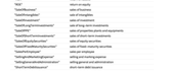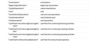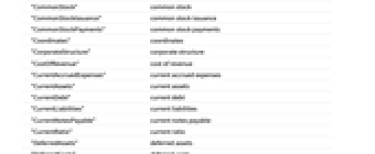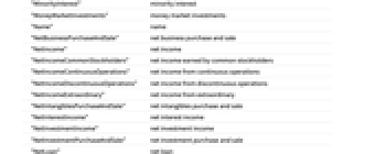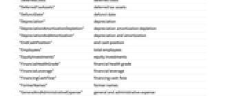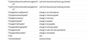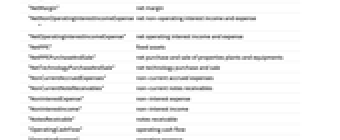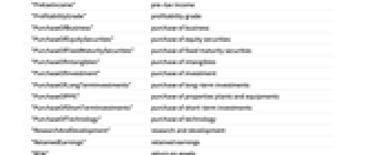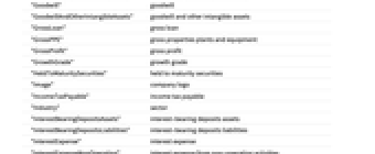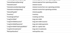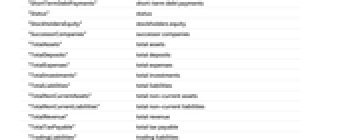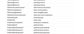 "AccountsPayable" accounts payable "AccountsReceivable" accounts receivable "AccumulatedDepreciation" accumulated depreciation "AdditionalPaidInCapital" additional paid-in capital "Address" address "Amortization" amortization "BeginningCashPosition" beginning cash position "CapitalExpenditure" capital expenditures "Cash" cash "CashAndCashEquivalents" cash and cash equivalents "CashDividendsPaid" cash dividends paid "CashEquivalents" cash equivalents "CashFlowFromContinuingFinancingActivities" cash flow from continuing financing activities "CashFlowFromContinuingInvestingActivities" cash flow from continuing investing activities "CashFlowFromContinuingOperatingActivities" cash flow from continuing operating activities "CashFlowFromDiscontinuedOperation" cash flow from discontinued operation "CashFromDiscontinuedFinancingActivities" cash from discontinued financing activities "CashFromDiscontinuedInvestingActivities" cash from discontinued investing activities "ChangeInAccruedExpense" change in accrued expense "ChangeInInterestPayable" change in interest payable "ChangeInInventory" change in inventory "ChangeInPayable" change in payable "ChangeInTaxPayable" change in tax payable "ChangeInWorkingCapital" change in working capital "ChangesInCash" change in cash and cash equivalents "ChangesInReceivables" change in receivables "City" city "CommonShares" common shares "CommonStock" common stock "CommonStockIssuance" common stock issuance "CommonStockPayments" common stock payments "Coordinates" coordinates "CorporateStructure" corporate structure "CostOfRevenue" cost of revenue "CurrentAccruedExpenses" current accrued expenses "CurrentAssets" current assets "CurrentDebt" current debt "CurrentLiabilities" current liabilities "CurrentNotesPayable" current notes payable "CurrentRatio" current ratio "DeferredAssets" deferred assets "DeferredCosts" deferred costs "DeferredTaxAssets" deferred tax assets "DefunctDate" defunct date "Depreciation" depreciation "DepreciationAmortizationDepletion" depreciation amortization depletion "DepreciationAndAmortization" depreciation and amortization "EndCashPosition" end cash position "Employees" total employees "EquityInvestments" equity investments "FinancialHealthGrade" financial health grade "FinancialLeverage" financial leverage "FinancingCashFlow" financing cash flow "FormerNames" former names "GeneralAndAdministrativeExpense" general and administrative expense "Goodwill" goodwill "GoodwillAndOtherIntangibleAssets" goodwill and other intangible assets "GrossLoan" gross loan "GrossPPE" gross properties plants and equipment "GrossProfit" gross profit "GrowthGrade" growth grade "HeldToMaturitySecurities" held to maturity securities "Image" company logo "IncomeTaxPayable" income tax payable "Industry" sector "InterestBearingDepositsAssets" interest-bearing deposits assets "InterestBearingDepositsLiabilities" interest-bearing deposits liabilities "InterestExpense" interest expense "InterestExpenseNonOperating" interest expense from non-operating activities "InterestExpenseOperating" interest expense from operating activities "InterestIncome" interest income "InterestIncomeNonOperating" interest income from non-operating activities "InterestIncomeOperating" interest income from operating activities "InterestPayable" interest payable "Inventory" inventory "InvestingCashFlow" investing cash flow "LongTermDebt" long-term debt "LongTermDebtIssuance" long-term debt issuance "LongTermDebtPayments" long-term debt payments "LongTermDebtTotalCapitalRatio" debt-to-capital ratio "LongTermInvestments" long-term investments "MetropolitanArea" metropolitan area "MinorityInterest" minority interest "MoneyMarketInvestments" money market investments "Name" name "NetBusinessPurchaseAndSale" net business purchase and sale "NetIncome" net income "NetIncomeCommonStockholders" net income earned by common stockholders "NetIncomeContinuousOperations" net income from continuous operations "NetIncomeDiscontinuousOperations" net income from discontinuous operations "NetIncomeExtraordinary" net income from extraordinary "NetIntangiblesPurchaseAndSale" net intangibles purchase and sale "NetInterestIncome" net interest income "NetInvestmentIncome" net investment income "NetInvestmentPurchaseAndSale" net investment purchase and sale "NetLoan" net loan "NetMargin" net margin "NetNonOperatingInterestIncomeExpense" net non-operating interest income and expense "NetOperatingInterestIncomeExpense" net operating interest income and expense "NetPPE" fixed assets "NetPPEPurchaseAndSale" net purchase and sale of properties plants and equipments "NetTechnologyPurchaseAndSale" net technology purchase and sale "NonCurrentAccruedExpenses" non-current accrued expenses "NonCurrentNoteReceivables" non-current notes receivables "NonInterestExpense" non-interest expense "NonInterestIncome" non-interest income "NotesReceivable" notes receivable "OperatingCashFlow" operating cash flow "OperatingExpense" operating expense "OperatingIncome" operating income "OperatingRevenue" operating revenue "OtherFinancialInstruments" other financial instruments "OtherIncomeExpense" other income expense "OtherIntangibleAssets" other intangible assets "OtherShortTermInvestments" other short-term investments "OwnershipType" ownership type "PostalCode" postal code "PredecessorCompanies" predecessor companies "PreferredStock" preferred stock "PreferredStockDividends" preferred stock dividends "PreferredStockIssuance" preferred stock issuance "PreferredStockPayments" preferred stock payments "PretaxIncome" pre-tax income "ProfitabilityGrade" profitability grade "PurchaseOfBusiness" purchase of business "PurchaseOfEquitySecurities" purchase of equity securities "PurchaseOfFixedMaturitySecurities" purchase of fixed maturity securities "PurchaseOfIntangibles" purchase of intangibles "PurchaseOfInvestment" purchase of investment "PurchaseOfLongTermInvestments" purchase of long-term investments "PurchaseOfPPE" purchase of properties plan