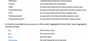 "Qualifiers" the list of possible qualifiers for the property "QualifierValues" the list of possible values that can be given to each qualifier "DefaultQualifierValues" the list of default values for the property's qualifiers "Description" a brief textual description of the property "Definition" a detailed textual definition of the property "Source" source information for the property "Date" the date associated with the entity-property value (if any) "PhysicalQuantity" the physical quantity associated with the entity-property value "Unit" the unit associated with the entity-property value "EntityAssociation" an association of entities and entity-property values "PropertyAssociation" an association of properties and entity-property values - If a function is provided as an annotation, it will be used to aggregate the result data. Typical aggregation functions include:
