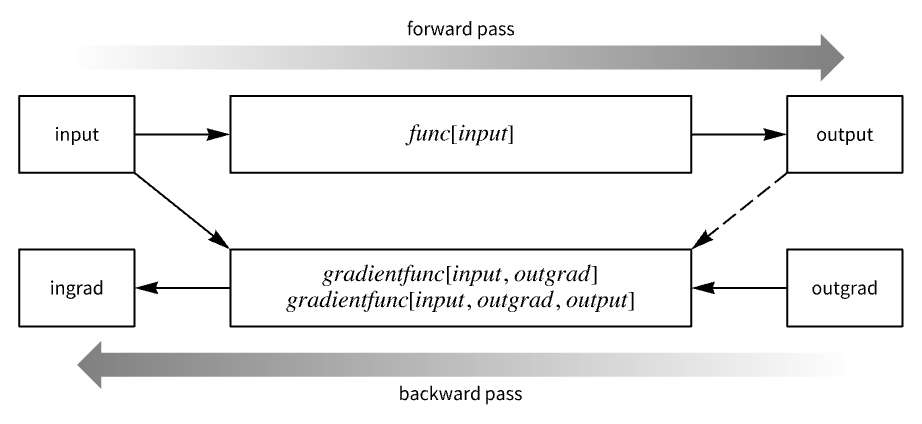 - The function gradientfunc is used to compute input gradients from output gradients, which is also known as the backward pass.