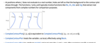- At positions where f does not evaluate to a real number, holes are left so that the background to the contour plot shows through. The functions f and g will typically involve functions like Re, Im, Abs and Arg that extract real components from complex numbers for comparison purposes.