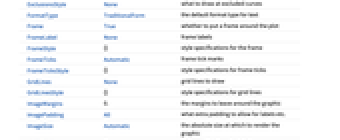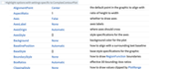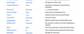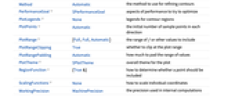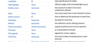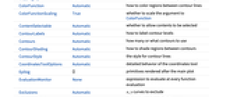AlignmentPoint Center the default point in the graphic to align with AspectRatio 1 ratio of height to width Axes False whether to draw axes AxesLabel None axes labels AxesOrigin Automatic where axes should cross AxesStyle {} style specifications for the axes Background None background color for the plot BaselinePosition Automatic how to align with a surrounding text baseline BaseStyle {} base style specifications for the graphic BoundaryStyle None how to draw RegionFunction boundaries BoxRatios Automatic effective 3D bounding-box ratios ClippingStyle None how to draw values clipped by PlotRange ColorFunction Automatic how to color regions between contour lines ColorFunctionScaling True whether to scale the argument to ColorFunction ContentSelectable Automatic whether to allow contents to be selected ContourLabels Automatic how to label contour levels Contours Automatic how many or what contours to use ContourShading Automatic how to shade regions between contours ContourStyle Automatic the style for contour lines CoordinatesToolOptions Automatic detailed behavior of the coordinates tool Epilog {} primitives rendered after the main plot EvaluationMonitor None expression to evaluate at every function evaluation Exclusions Automatic x,y curves to exclude ExclusionsStyle None what to draw at excluded curves FormatType TraditionalForm the default format type for text Frame True whether to put a frame around the plot FrameLabel None frame labels FrameStyle {} style specifications for the frame FrameTicks Automatic frame tick marks FrameTicksStyle {} style specifications for frame ticks GridLines None grid lines to draw GridLinesStyle {} style specifications for grid lines ImageMargins 0. the margins to leave around the graphic ImagePadding All what extra padding to allow for labels etc. ImageSize Automatic the absolute size at which to render the graphic LabelStyle {} style specifications for labels LightingAngle None effective angle of the simulated light source MaxRecursion Automatic the maximum number of recursive subdivisions allowed Mesh None how many mesh lines in each direction to draw MeshFunctions {} how to determine the placement of mesh lines MeshStyle Automatic the style for mesh lines Method Automatic the method to use for refining contours PerformanceGoal $PerformanceGoal aspects of performance to try to optimize PlotLabel None an overall label for the plot PlotLegends None legends for contour regions PlotPoints Automatic the initial number of sample points in each direction PlotRange {Full,Full,Automatic} the range of f or other values to include PlotRangeClipping True whether to clip at the plot range PlotRangePadding Automatic how much to pad the range of values PlotRegion Automatic the final display region to be filled PlotTheme $PlotTheme overall theme for the plot PreserveImageOptions Automatic whether to preserve image options when displaying new versions of the same graphic Prolog {} primitives rendered before the main plot RegionFunction (True&) how to determine whether a point should be included RotateLabel True whether to rotate y labels on the frame ScalingFunctions None how to scale individual coordinates Ticks Automatic axes ticks TicksStyle {} style specifications for axes ticks WorkingPrecision MachinePrecision the precision used in internal computations