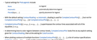 AspectRatio 1 ratio of height to width BoundaryStyle None how to draw RegionFunction boundaries BoxRatios Automatic effective 3D bounding-box ratios ClippingStyle None how to draw values clipped by PlotRange ColorFunction Automatic how to color regions between contour lines ColorFunctionScaling True whether to scale the argument to ColorFunction ContourLabels Automatic how to label contour levels Contours Automatic how many or what contours to use ContourShading Automatic how to shade regions between contours ContourStyle Automatic the style for contour lines EvaluationMonitor None expression to evaluate at every function evaluation Exclusions Automatic x,y curves to exclude ExclusionsStyle None what to draw at excluded curves Frame True whether to put a frame around the plot FrameTicks Automatic frame tick marks LightingAngle None effective angle of the simulated light source MaxRecursion Automatic the maximum number of recursive subdivisions allowed Mesh None how many mesh lines in each direction to draw MeshFunctions {} how to determine the placement of mesh lines MeshStyle Automatic the style for mesh lines Method Automatic the method to use for refining contours PerformanceGoal $PerformanceGoal aspects of performance to try to optimize PlotLegends None legends for contour regions PlotPoints Automatic the initial number of sample points in each direction PlotRange {Full,Full,Automatic} the range of f or other values to include PlotRangeClipping True whether to clip at the plot range PlotRangePadding Automatic how much to pad the range of values PlotTheme $PlotTheme overall theme for the plot RegionFunction (True&) how to determine whether a point should be included ScalingFunctions None how to scale individual coordinates WorkingPrecision MachinePrecision the precision used in internal computations - Typical settings for PlotLegends include: