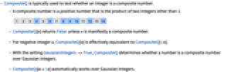 - With the setting GaussianIntegers->True, CompositeQ determines whether a number is a composite number over Gaussian integers.