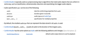 - ConformAudio is typically used as a preprocessing step to algorithms that need audio objects that are uniform in some way, such as classification, dimensionality reduction and assembling into bigger audio objects.