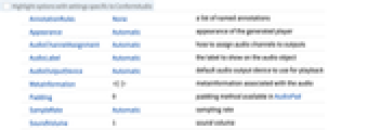 AnnotationRules None a list of named annotations Appearance Automatic appearance of the generated player AudioChannelAssignment Automatic how to assign audio channels to outputs AudioLabel Automatic the label to show on the audio object AudioOutputDevice Automatic default audio output device to use for playback MetaInformation metainformation associated with the audio Padding 0 padding method available in AudioPad SampleRate Automatic sampling rate SoundVolume 1 sound volume