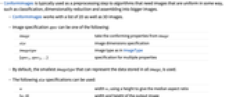 - ConformImages is typically used as a preprocessing step to algorithms that need images that are uniform in some way, such as classification, dimensionality reduction and assembling into bigger images.