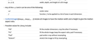 val scalar value f function f to be applied to a list of sizes in each dimension - ConformImages[{image1,image2,…}] resizes all images to have the median width and a height to give the median aspect ratio.