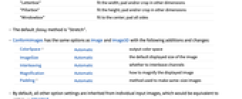 ColorSpace Automatic output color space ImageSize Automatic the default displayed size of the image Interleaving Automatic whether to interleave channels Magnification Automatic how to magnify the displayed image Padding Automatic method used to make same-size images - By default, all other option settings are inherited from individual input images, which would be equivalent to option->Inherited.