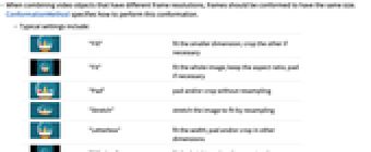 - When combining video objects that have different frame resolutions, frames should be conformed to have the same size. ConformationMethod specifies how to perform this conformation.