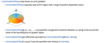 - ConicGradientFilling[{col1,col2,…,coln}] specifies a progressive transition between coli along circles around the center of the bounding box of a graphic object.