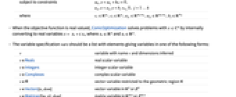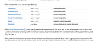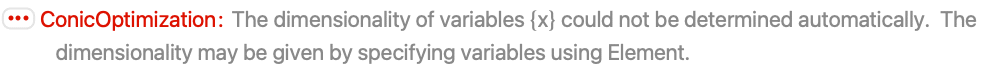 convex domain or region element - With ConicOptimization[f,cons,vars], parameter equations of the form parval, where par is not in vars and val is numerical or an array with numerical values, may be included in the constraints to define parameters used in f or cons. »