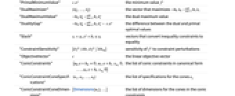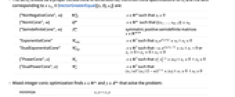 "ConicConstraintConeDimensions" ![{TemplateBox[{Dimensions, paclet:ref/Dimensions}, RefLink, BaseStyle -> {3ColumnTableMod}][kappa_1],...} {TemplateBox[{Dimensions, paclet:ref/Dimensions}, RefLink, BaseStyle -> {3ColumnTableMod}][kappa_1],...}](Files/ConicOptimization.en/75.png)
