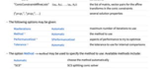 the list of matrix, vector pairs for the affine transforms in the conic constraints {"prop1","prop2",…} several solution properties - The following options may be given: