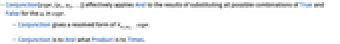 - Conjunction[expr,{a1,a2,…}] effectively applies And to the results of substituting all possible combinations of True and False for the ai in expr.