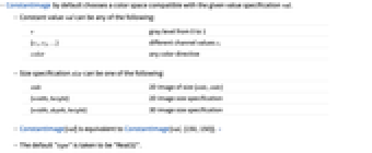 side 2D image of size {side,side} {width,height} 2D image size specification {width,depth,height} 3D image size specification - ConstantImage[val] is equivalent to ConstantImage[val,{150,150}]. »