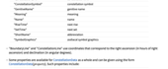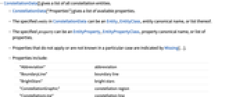 - Some properties are available for ConstellationData as a whole and can be given using the form ConstellationData[property]. Such properties include: