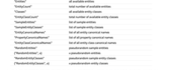 "Entities" all available entities "EntityCount" total number of available entities "Classes" all available entity classes "EntityClassCount" total number of available entity classes "SampleEntities" list of sample entities "SampleEntityClasses" list of sample entity classes "EntityCanonicalNames" list of all entity canonical names "PropertyCanonicalNames" list of all property canonical names "EntityClassCanonicalNames" list of all entity class canonical names "RandomEntities" pseudorandom sample entities {"RandomEntities",n} n pseudorandom entities "RandomEntityClasses" pseudorandom sample entity classes {"RandomEntityClasses",n} n pseudorandom entity classes - The following annotations can be used in the third argument of ConstellationData[entity,property,annotation]: