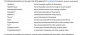 "Qualifiers" the list of possible qualifiers for the property "QualifierValues" the list of possible values that can be given to each qualifier "DefaultQualifierValues" the list of default values for the property's qualifiers "Description" a brief textual description of the property "Definition" a detailed textual definition of the property "Source" source information for the property "Date" the date associated with the entity-property value (if any) "PhysicalQuantity" the physical quantity associated with the entity-property value "Unit" the unit associated with the entity-property value "EntityAssociation" an association of entities and entity-property values "PropertyAssociation" an association of properties and entity-property values - If a function is provided as an annotation, it will be used to aggregate the result data. Typical aggregation functions include: