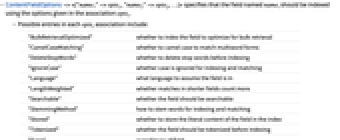 - ContentFieldOptions-><|"name1"->opts1,"name2"->opts2,…|> specifies that the field named namei should be indexed using the options given in the association optsi.