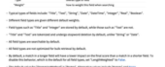 "BulkRetrievalOptimized" whether to index the field to optimize for bulk retrieval "CamelCaseMatching" whether to camel case to match multiword forms "DeleteStopWords" whether to delete stop words before indexing "IgnoreCase" whether case is ignored for indexing and matching "Language" what language to assume the field is in "LengthWeighted" whether matches in shorter fields count more "Searchable" whether the field should be searchable "StemmingMethod" how to stem words for indexing and matching "Stored" whether to store the literal content of the field in the index "Tokenized" whether the field should be tokenized before indexing "Type" overall type of field "Weight" how to weight this field when searching - Typical types of fields include: "Title", "Text", "String", "Date", "DateTime", "Integer", "Real", "Boolean".