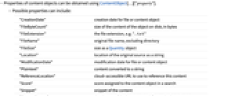 "CreationDate" creation date for file or content object "FileByteCount" size of the content of the object on disk, in bytes "FileExtension" the file extension, e.g. ".txt" "FileName" original file name, excluding directory "FileSize" size as a Quantity object "Location" location of the original source as a string "ModificationDate" modification date for file or content object "Plaintext" content converted to a string "ReferenceLocation" cloud-accessible URL to use to reference this content "Score" score assigned to the content object in a search "Snippet" snippet of the content "SnippetSource" cloud-accessible document path for producing snippets - Some properties, such as "Snippet", are typically only computed when requested.