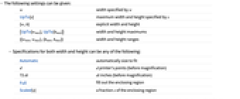 w width specified by w UpTo[s] maximum width and height specified by s {w,h} explicit width and height {UpTo[wmax],UpTo[hmax]} width and height maximums {{wmin,wmax},{hmin,hmax}} width and height ranges - Specifications for both width and height can be any of the following: