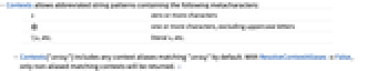 - Contexts allows abbreviated string patterns containing the following metacharacters: