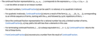 - For quadratic irrationals, ContinuedFraction[x] returns a result of the form {a1,a2,…,{b1,b2,…}}, corresponding to an infinite sequence of terms, starting with the ai, and followed by cyclic repetitions of the bi. »