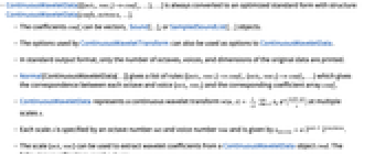 - ContinuousWaveletData[{{oct1,voc1}->coef1,…},…] is always converted to an optimized standard form with structure ContinuousWaveletData[coefs,octvocs,…].