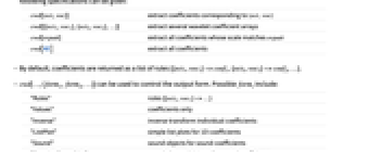 cwd[{oct,voc}] extract coefficients corresponding to {oct,voc} cwd[{{oct1,voc1},{oct2,voc2},…}] extract several wavelet coefficient arrays cwd[ovpatt] extract all coefficients whose scale matches ovpatt cwd[All] extract all coefficients - By default, coefficients are returned as a list of rules {{oct1,voc1}->coef1,{oct2,voc2}->coef2,…}.
