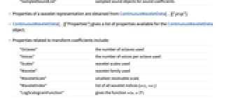 "Rules" rules {{oct1,voc1}->…} "Values" coefficients only "Inverse" inverse transform individual coefficients "ListPlot" simple list plots for 1D coefficients "Sound" sound objects for sound coefficients "SampledSoundList" sampled sound objects for sound coefficients - Properties of a wavelet representation are obtained from ContinuousWaveletData[…]["prop"].