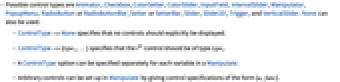 - Possible control types are Animator, Checkbox, ColorSetter, ColorSlider, InputField, IntervalSlider, Manipulator, PopupMenu, RadioButton or RadioButtonBar, Setter or SetterBar, Slider, Slider2D, Trigger, and VerticalSlider. None can also be used.